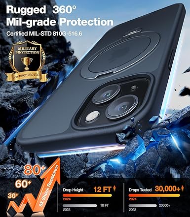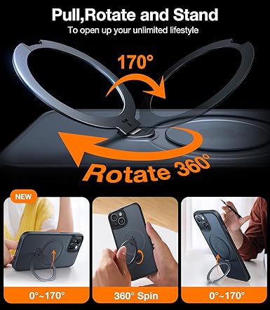 •  2024 Upgrade Ostand Spin Series for iPhone 14/15 Case, a groundbreaking case that integrates magnets, a 360°spin kickstand also as a ring holder, military-grade protection, and much more fun.