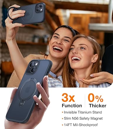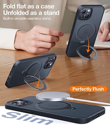 • [3-in-1 Versatile Kickstand] Not only a stand, but the ring also integrates charging and ring holder, all at once. Whether you prefer a vertical setup for video calls or a horizontal orientation for TV shows, this iPhone 14/15 case with kickstand has got you covered. It doubles as a handy ring holder for you to hook when your hands are full, allowing effortless one-finger handling. The highly conductive zinc alloy kickstand enables fast charging without the need for removal.
