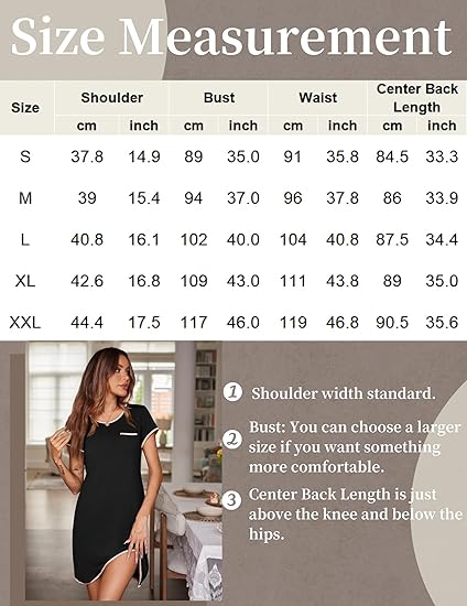 - 【Size】S-2XL, our women’s sleepwear night shirt dress are perfect for women of all ages and sizes. You can choose your size by referring to our size measurement. Clothes have no peculiar smell, you can buy with confidence.