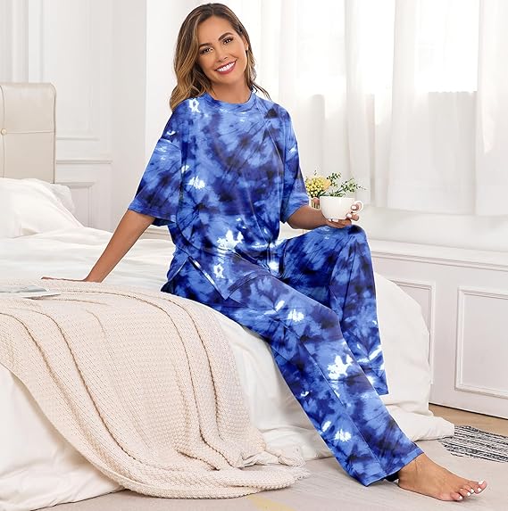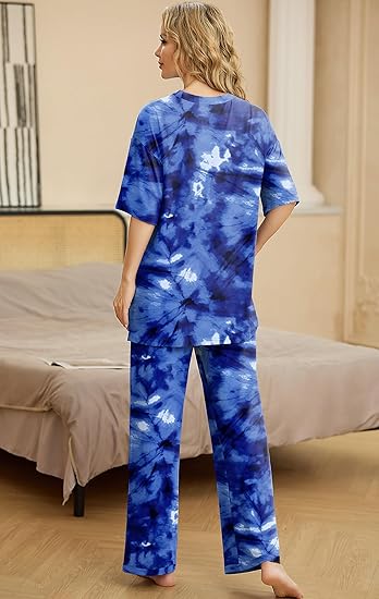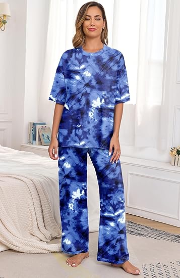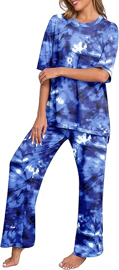 PrinStory Womens Pajamas Sets 2 Piece Lounge Set Short Sleeve Tops and Long Pants Soft Pjs Loungewear with Pockets