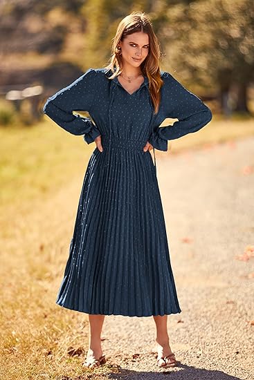 - CHIC DESIGN: Midi Dress For Women/Fit And Flare Dress For Women/Pleated Dress For Women/Tie Neck Dress For Women/Ruffle Dress For Women/Swiss Dot Dress For Women/A Line Dress For Women/Swing Dress For Women/Flowy Dress For Women/Fall Dress For Women/V Neck Dress For Women/Long Sleeve Dress For Women