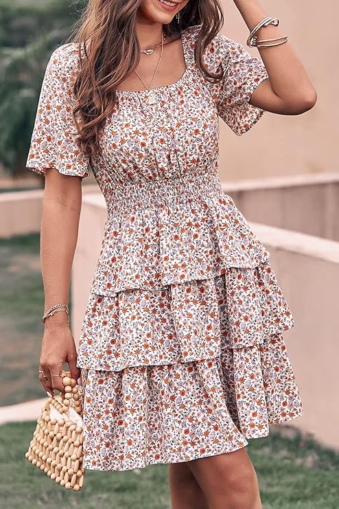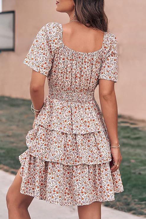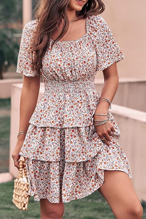 - TRENDY DESIGN: Square Neck Boho Dress For Women/Floral Print Short Dress For Women/Swing Dress For Women/Short Sleeve Mini Dress For Women/High Waist A-Line Dress For Women/Tiered Fit And Flare Dress For Women/Summer Dress For Women/Casual Beach Dress For Women/Party Dress For Women/Ruffle Dress For Women