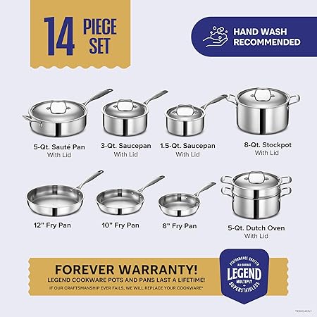 LEGEND COOKWARE 5 Ply Stainless Steel Pots and Pans Set | 14-Piece, Induction, Non-Toxic, Oven Safe | Best 18/0 Full Clad | Professional Kitchen Cooking, Heavy Chef Quality | PFOA, PTFE & PFOS Free