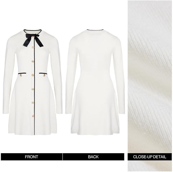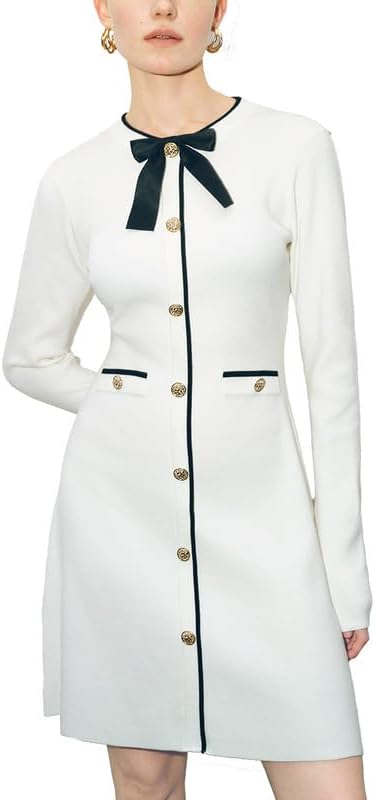 Women’s Sweater Dress Long Sleeve Knit Button Down Dress Bow Tie Crew Neck Mini A-Line Dresses Fall Winter